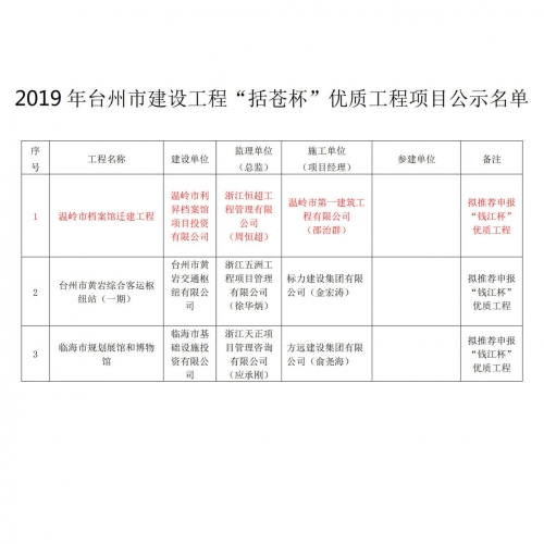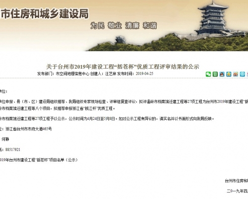2019年台州市建设工程括苍杯奖(优质工程)