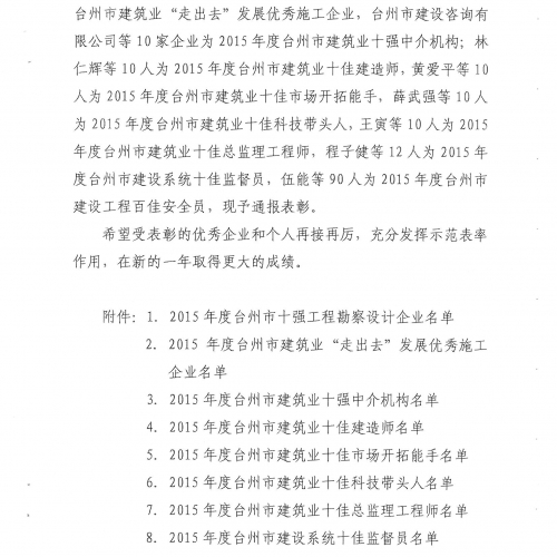 2015年度台州市建筑业十佳总监理工程师