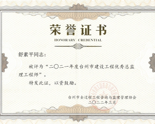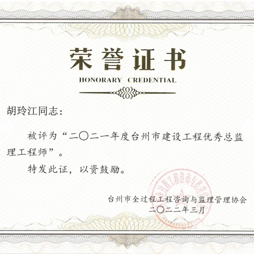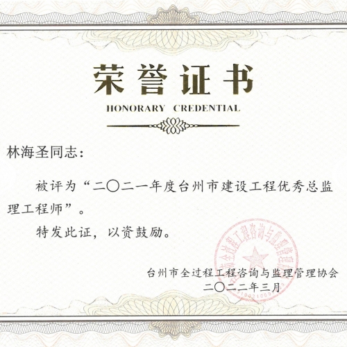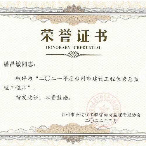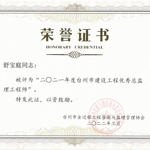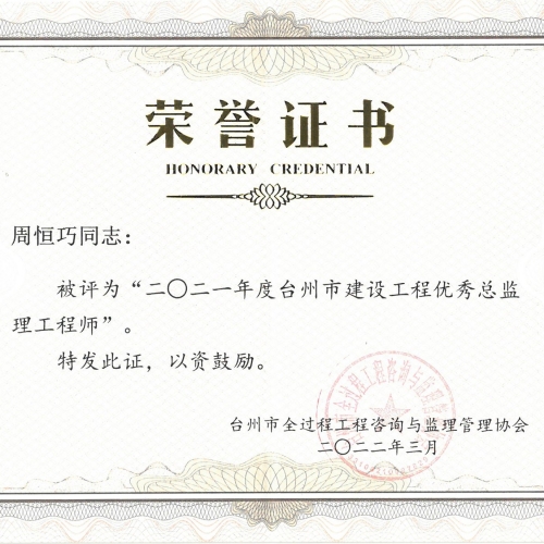 2021年度台州市建设工程优秀总监理工程师